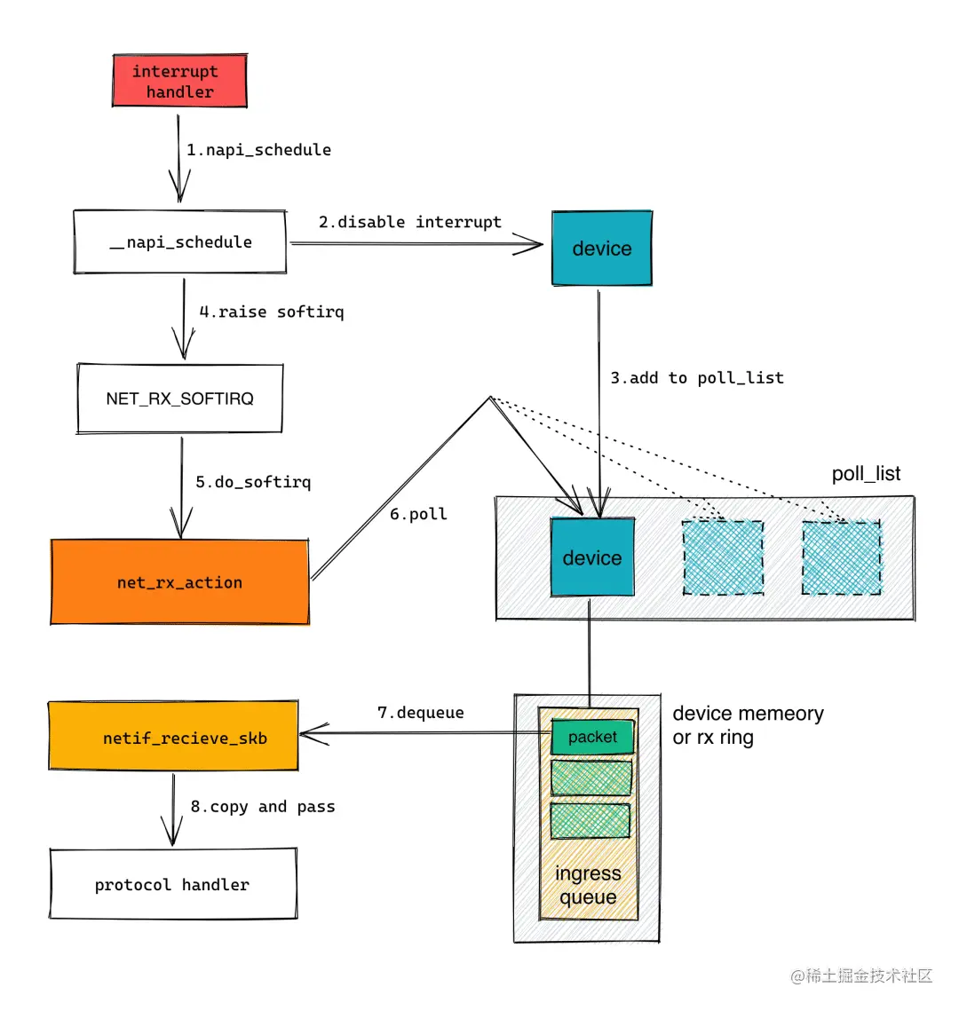 - 一直执行该流程直到 poll_list 被清空,或者 net_rx_action 执行完了足够的时间片(为了不过多占用 CPU 资源),这种情况退出前 net_rx_action 会重新调度自己的下一次执行。