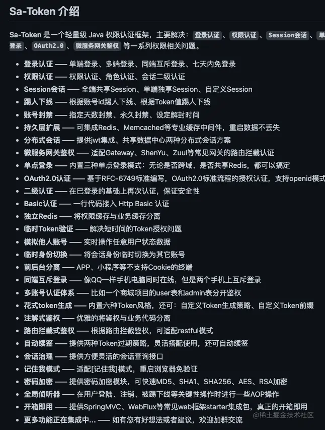 另外,不用 JWT 直接使用普通的 Token(随机生成,不包含具体的信息) 结合 Redis 来做身份认证也是可以的。我在 「优质开源项目推荐」 的第 8 期推荐过的 Sa-Token 这个项目是一个比较完善的 基于 JWT 的身份认证解决方案,支持自动续签、踢人下线、账号封禁、同端互斥登录等功能,感兴趣的朋友可以看看。