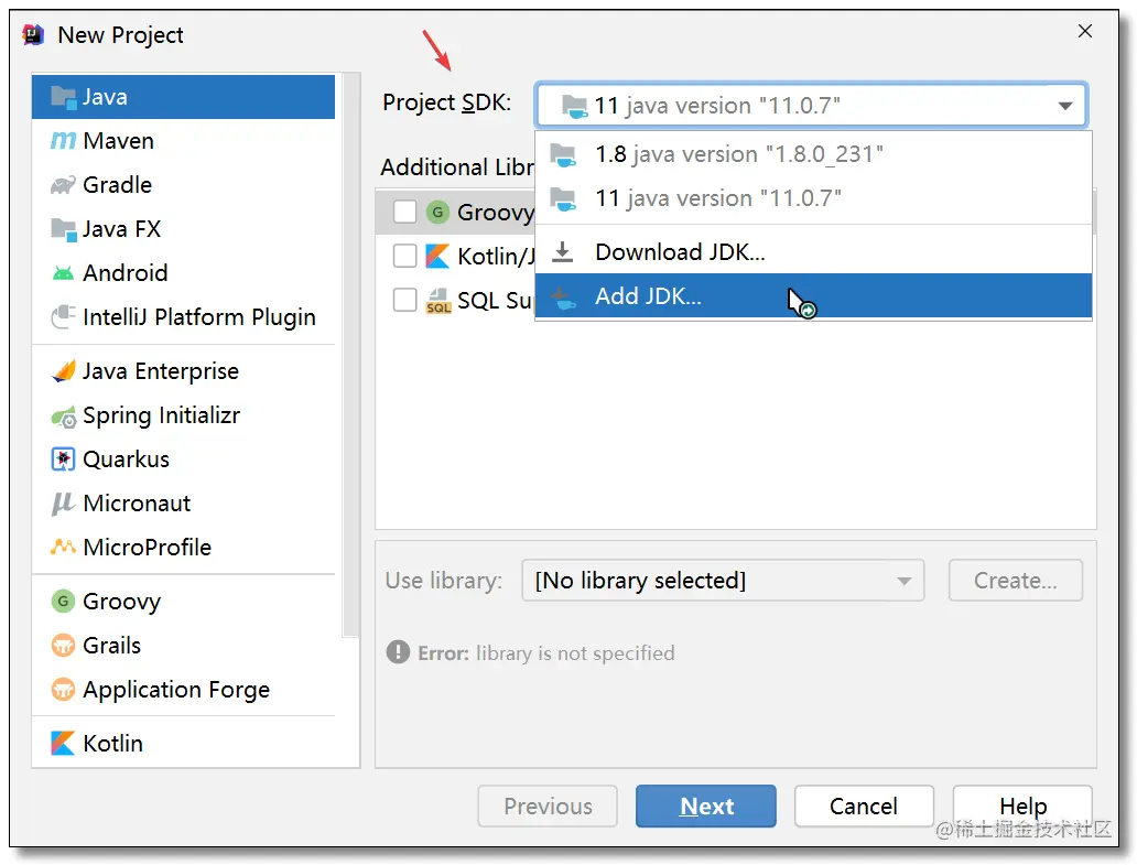 欢迎界面点击:Projects -> New Project,在弹出的窗口中选择Project SDK -> Add JDK...