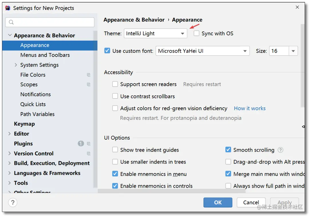 欢迎界面点击:Customize -> All settings...,在外观和行为Appearance & Behavior中选择Appearance进行设置。