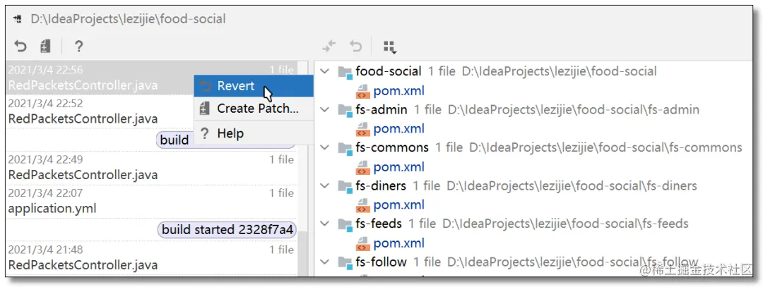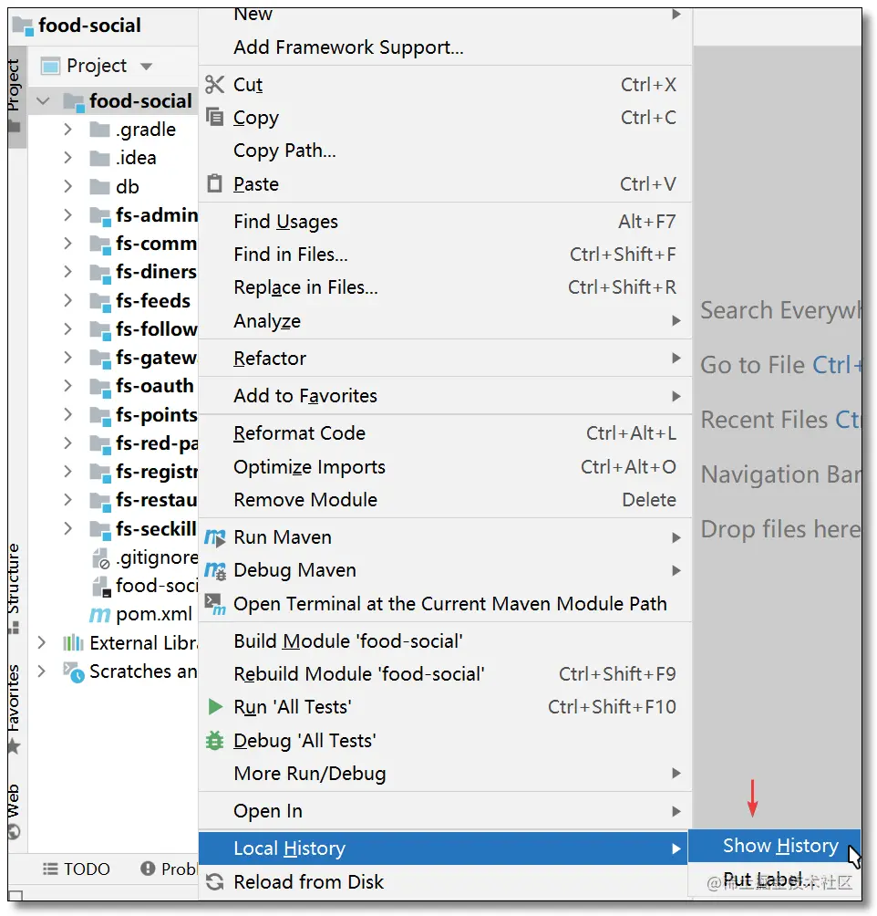 开发项目最头疼的就是代码版本迭代管理,不过这个问题可以通过版本控制工具 Git、SVN 等工具来解决。对于某些喜欢偷懒的同学不添加版本控制就直接开撸代码,万一出错需要回滚怎么办?IDEA 还提供了本地历史记录功能,方便回滚。项目右键 -> Local History -> Show History。