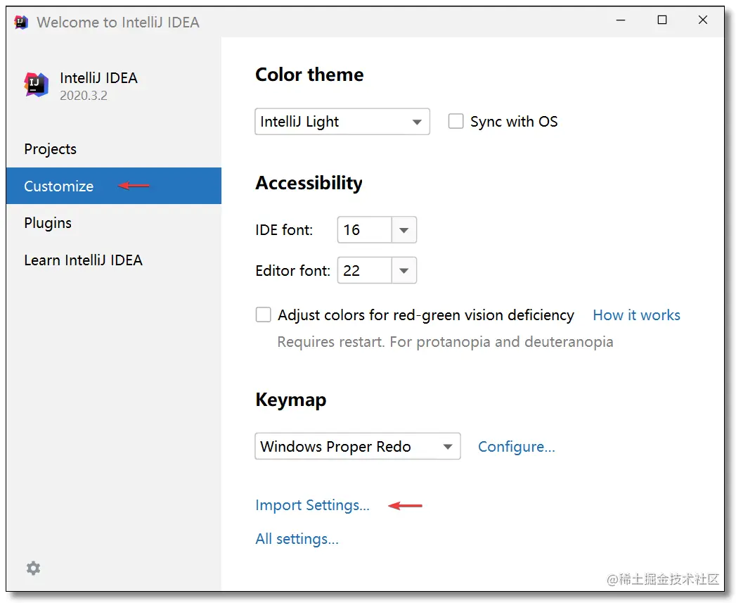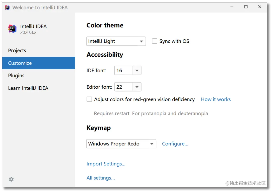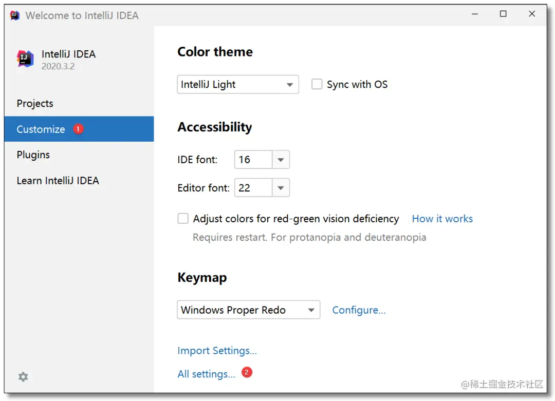 IDEA 新版本重新制作了欢迎界面,所有的配置项都可以直接在欢迎界面:Customize -> All settings...中进行设置,后续不再赘述。