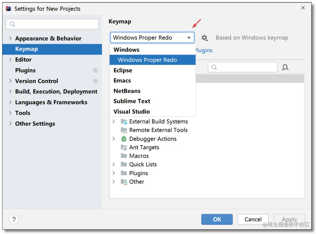 欢迎界面点击:Customize -> All settings... -> Keymap下拉框中进行选择。