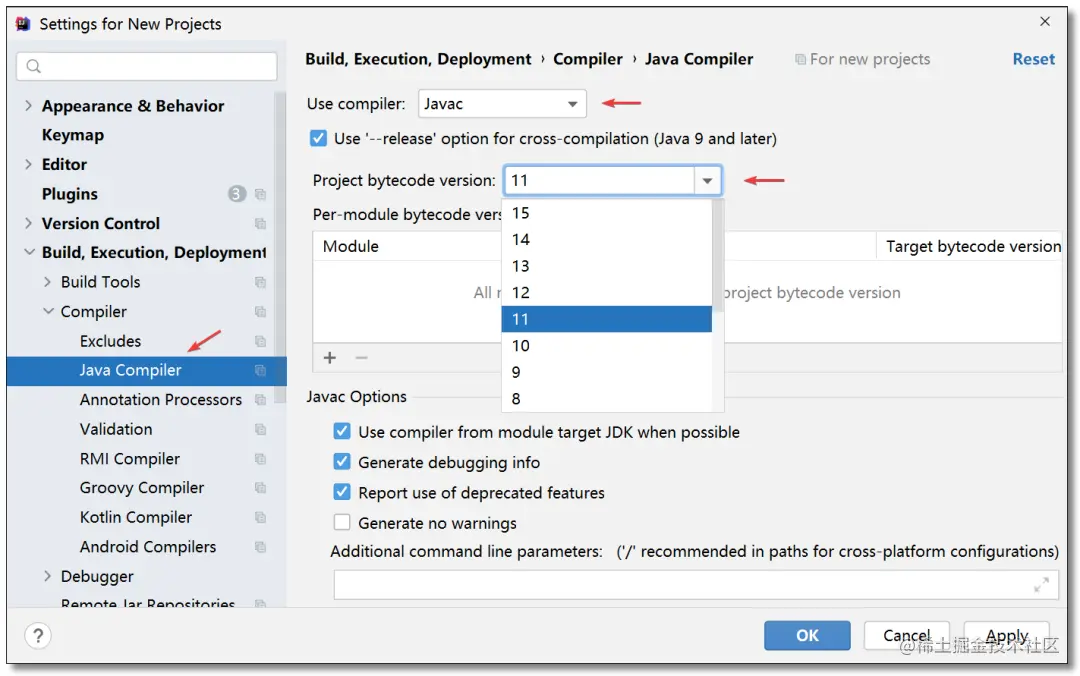 推荐使用 Javac 编译器,Project bytecode version 根据当前项目使用的 JDK 版本进行统一。