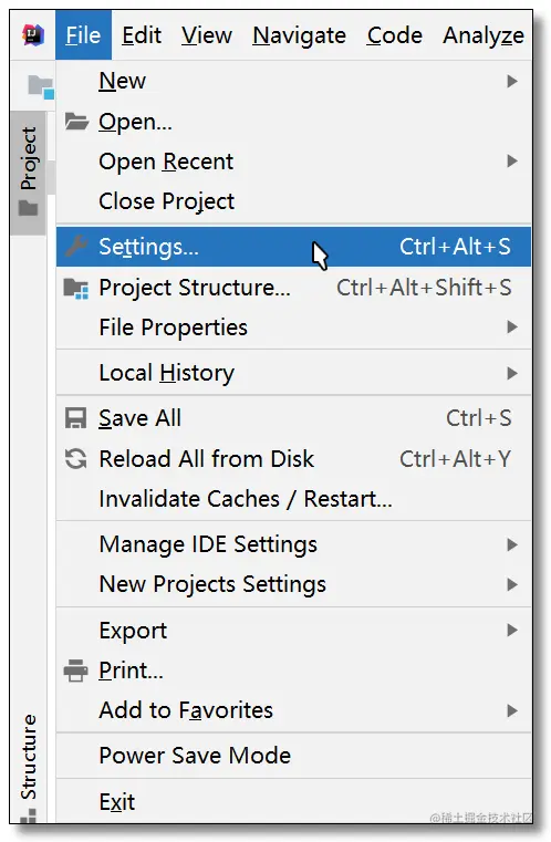 如果是打开项目的界面下,点击菜单:File -> Settings...进行设置。