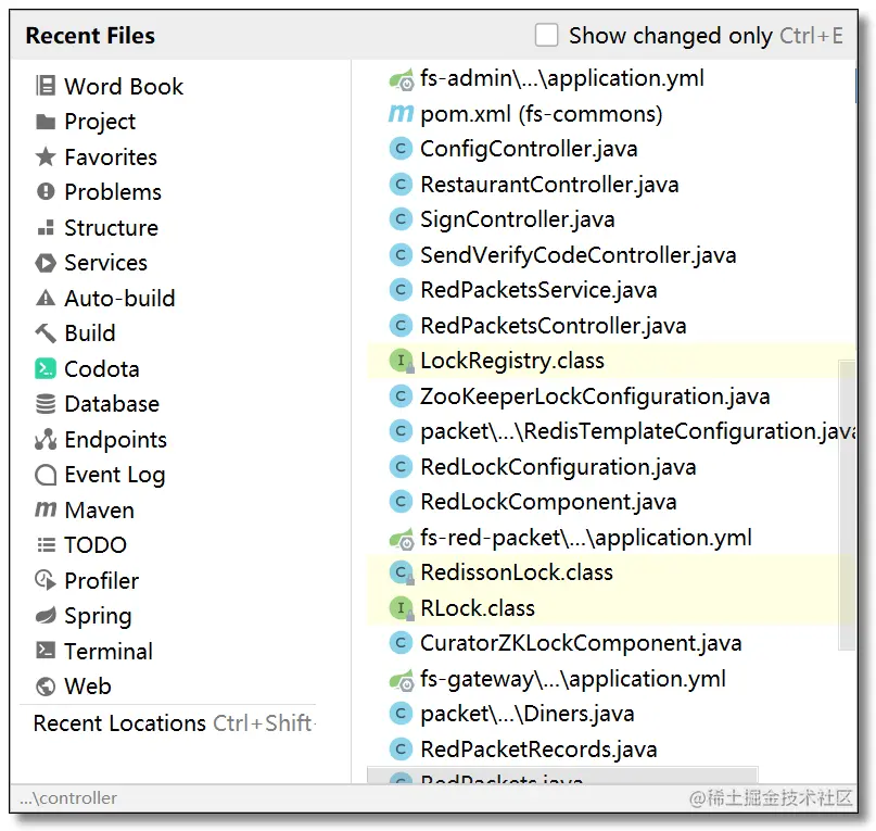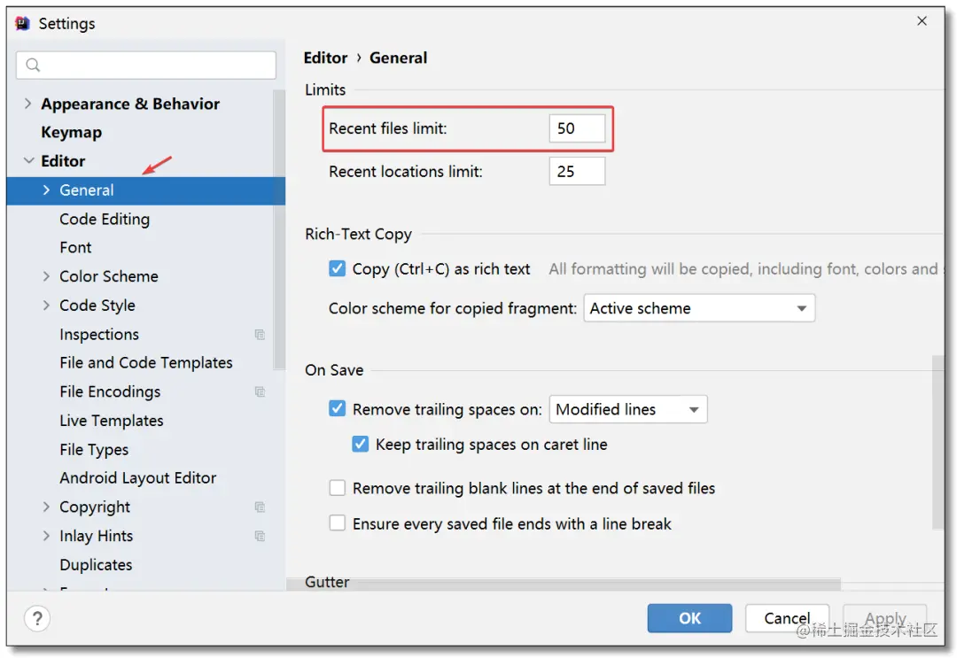 教大家一个小技巧,可以使用 Ctrl + E 打开最近操作过的文件,Recent files limit 设置记录最近使用的文件个数。