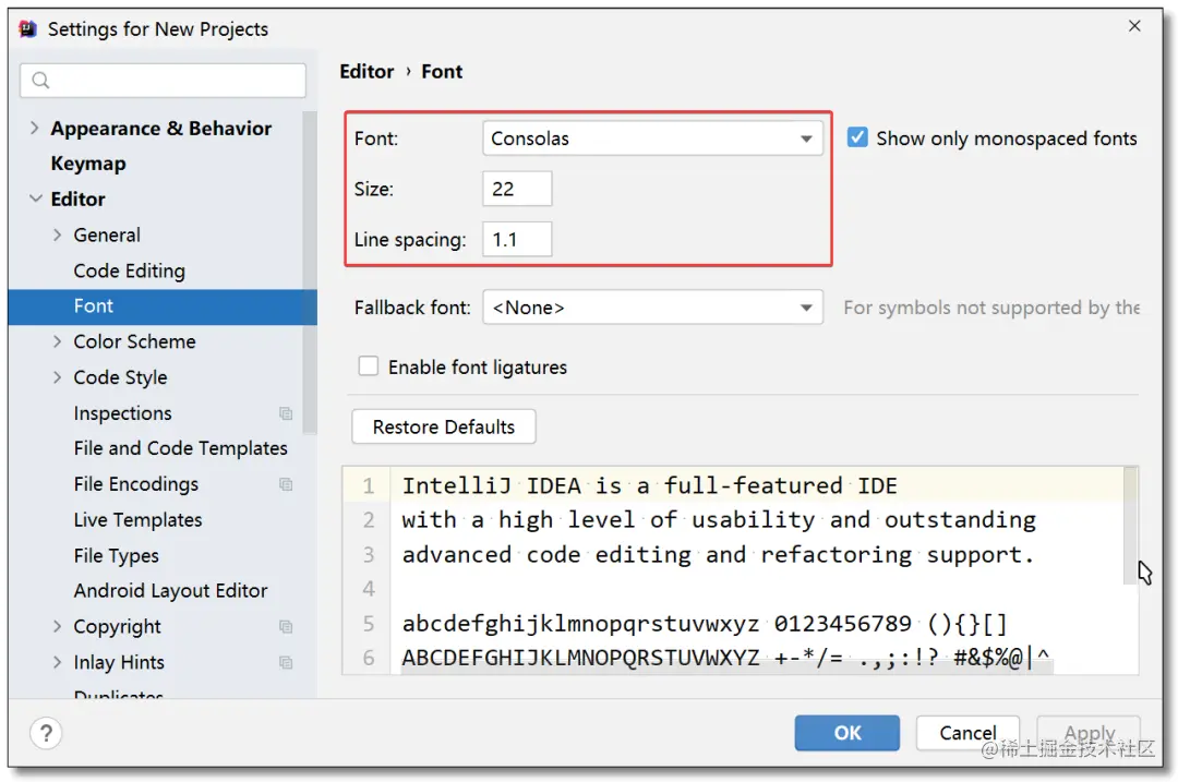 欢迎界面点击:Customize -> All settings...,在编辑Editor中选择font设置文本(也就是我们写的代码)字体及大小及行间距。