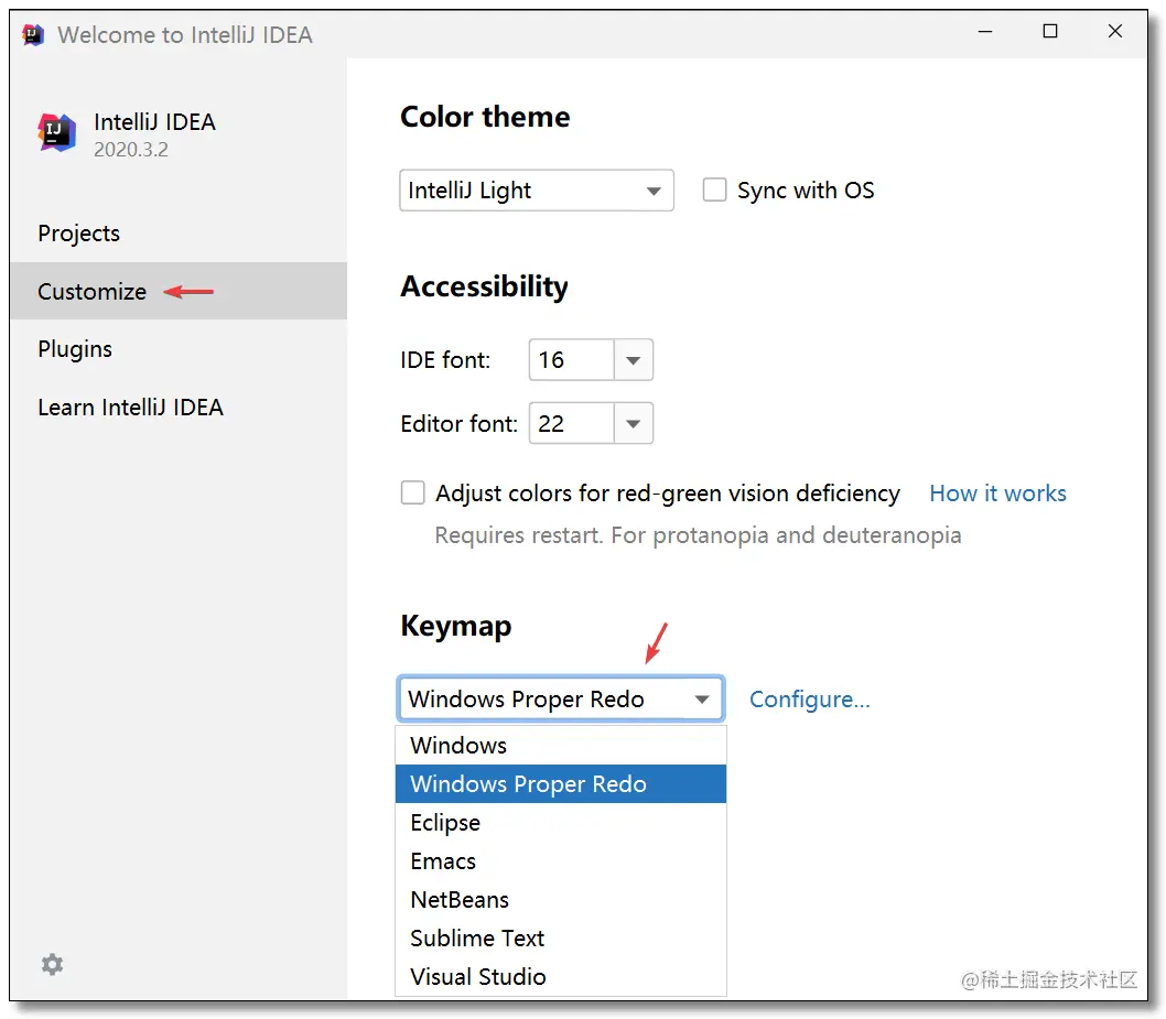 在新版本的欢迎界面中可以直接进行字体设置,点击:Customize,在Keymap下拉框中进行选择。