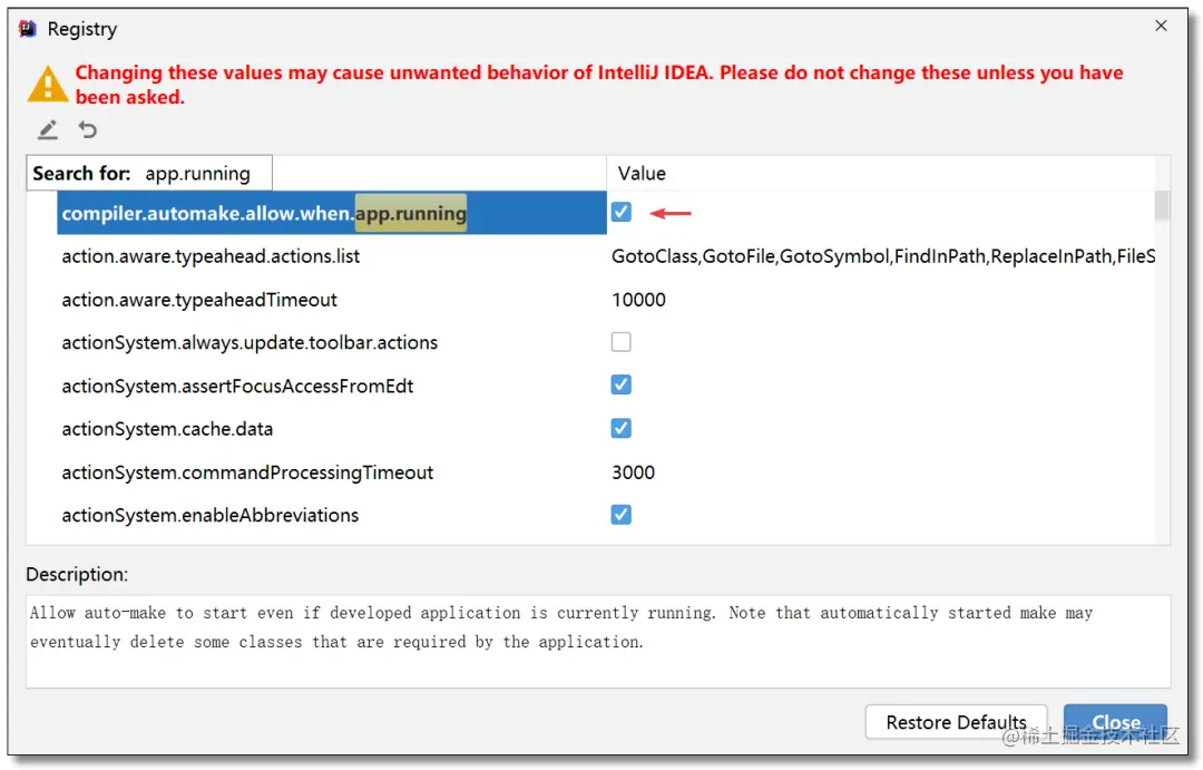 运行时自动编译功能开启步骤:Ctrl + Shift + Alt + / 选择 Registry...,搜索 compiler.automake.allow.when.app.running,然后勾选。