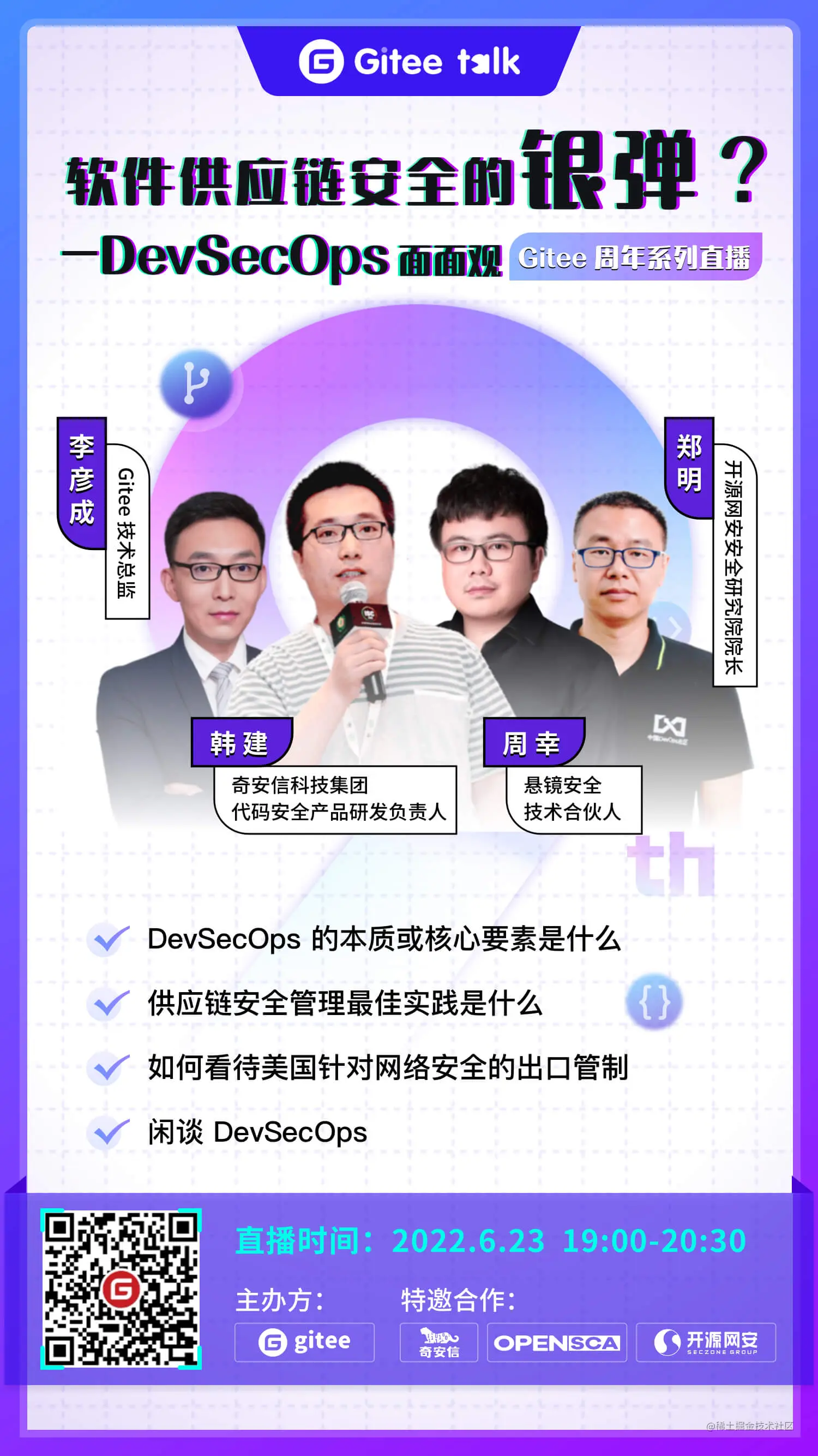 6月23日,下周四晚上19:00-20:30 Gitee Talk 特邀来自奇安信、悬镜安全、开源网安和 Gitee 的 4 位技术大佬做客直播间,以线上圆桌的形式为大家带来 《 软件供应链安全的银弹?—— DevSecOps 面面观 》 的讨论与分享。