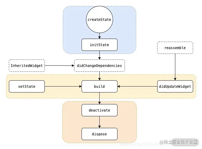 - didChangeDependencies ,该函数是在该组件依赖的 State 发生变化时,这里说的 State 为全局 State ,例如语言或者主题等,类似于前端 Redux 存储的 State 。