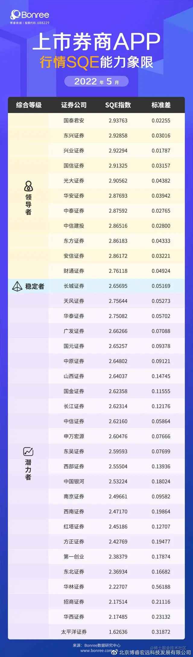 在2022年5月行情SQE能力象限中,11家券商入围领导者象限,分别是国泰君安、东兴证券、兴业证券、国信证券、光大证券、华安证券、中泰证券、中信建投、东方证券、安信证券、财通证券。(排名不分先后)其中,东兴证券、国泰君安、兴业证券、中泰证券、东方证券、安信证券、中信建投凭借其在性能和效率方面的优异表现,再次位列领导者象限,国信证券、光大证券、华安证券由上月的冲刺者象限上升至本月的领导者象限,财通证券由上月的稳定者象限上升至本月的领导者象限。