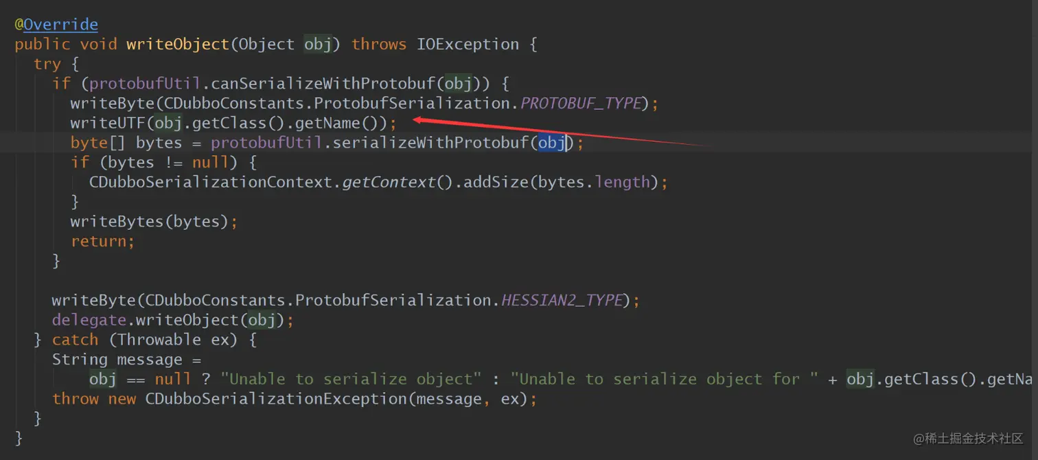 下图分别为框架的protobuf序列化与反序列化方法,可见response的序列化写入了对象的真实class信息,但是,和request的反序列化一样,此处真实的class name未使用。但是实际上在readObject(Class cls)中,传入的是接口的Return Type的Class信息。