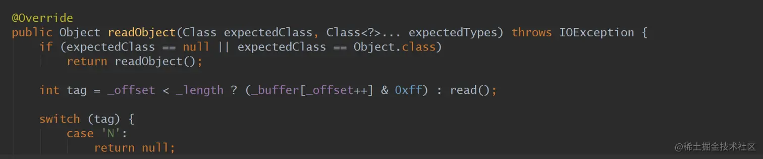 因为如果exceptClass为Object.class,此处会使用真实的对象类型作为反序列化的class,不会使用接口的参数类型。