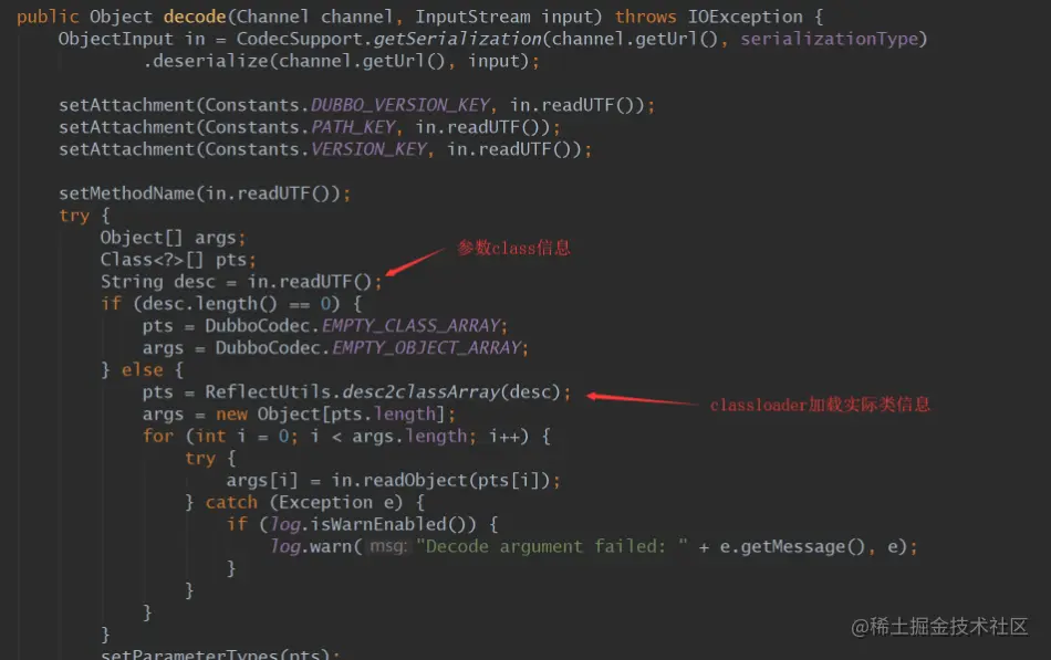 可见request时,已经把ParameterType带给了服务端,服务端会拿到此Class信息,进行反序列化。则不需要传入实际对象类型,具体代码段为DecodeableRpcInvocation中的decode方法: