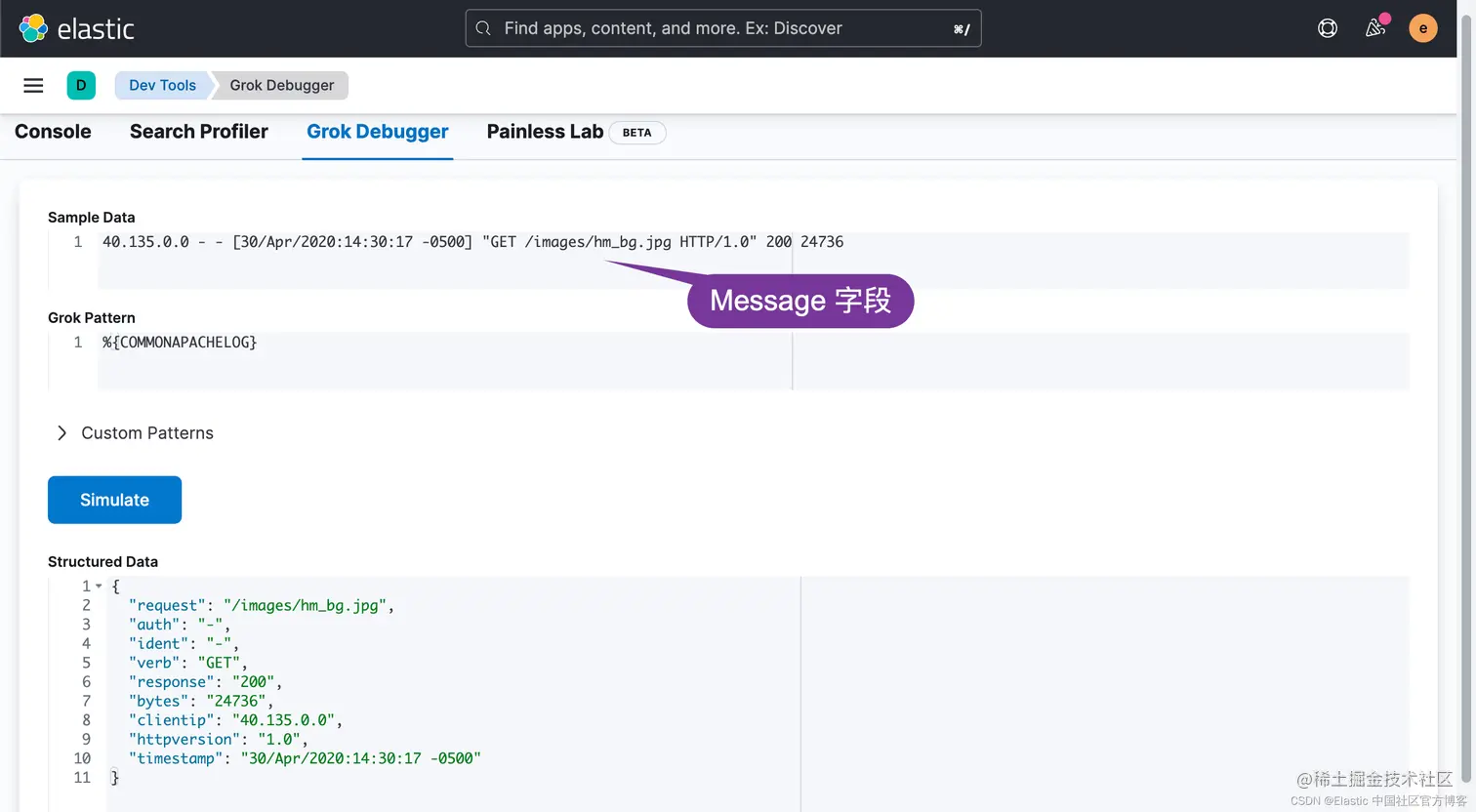你可以使用 dissect 来获得与使用 grok 模式解析 Apache 日志相同的结果。 你不是匹配日志模式,你需要包含要丢弃的字符串部分。 特别注意要丢弃的字符串部分将有助于构建成功的 dissect 模式。