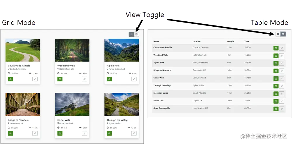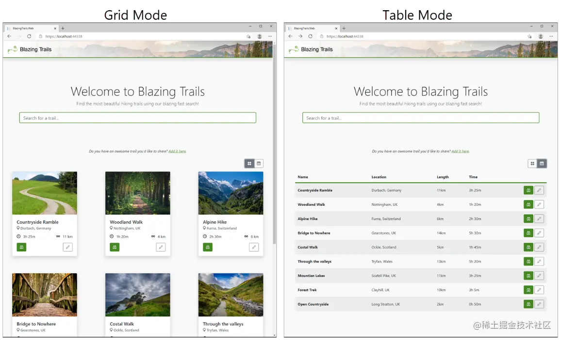 在这篇文章中,我们将把可重用性提高到新的水平。我们将学习如何利用模板和泛型来制作最终的可重用组件。为了给我们一个实际的例子,我们将用一个组件来增强一个叫做Blazing Trails的网站的主页,这个组件允许用户在网格和表格之间切换布局(图1)。