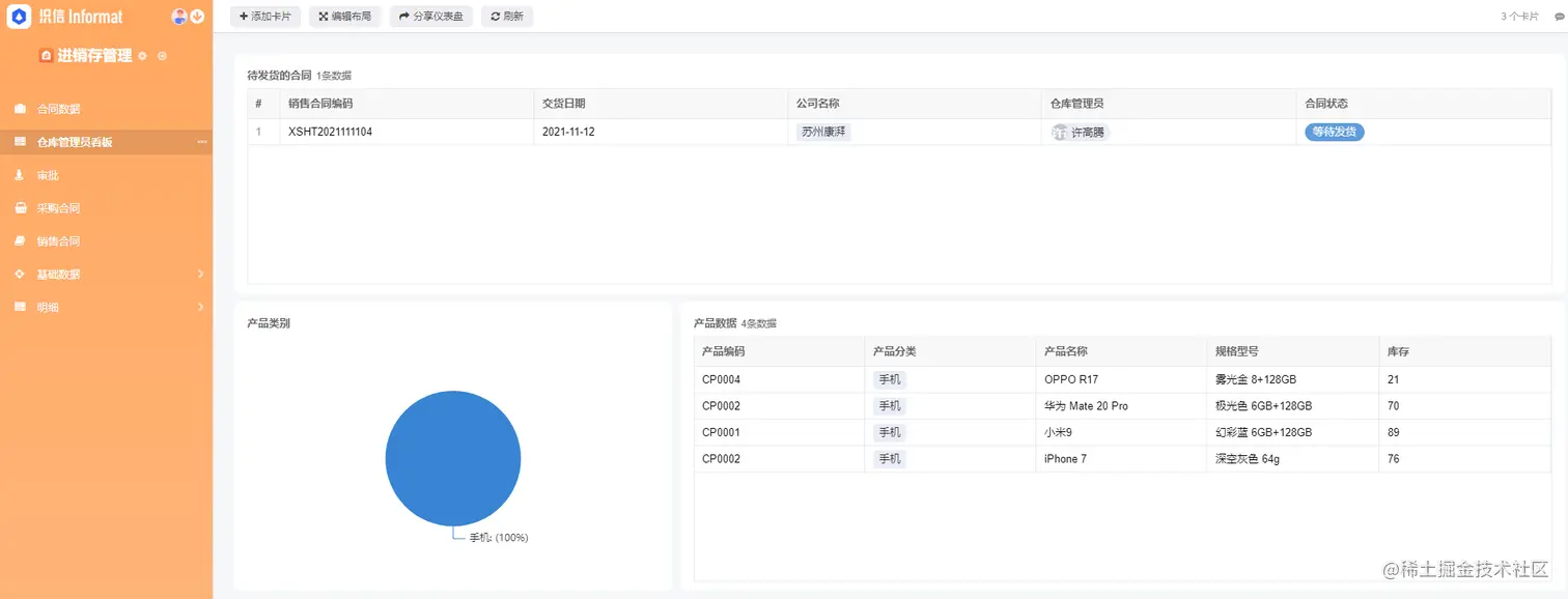 进销存系统主要包含:合同数据、仓库管理员看板、审批、采购合同、销售合同、产品数据、产品分类、客户数据、供应商数据、采购明细、采购入库明细、销售明细、采购退货等13个模块