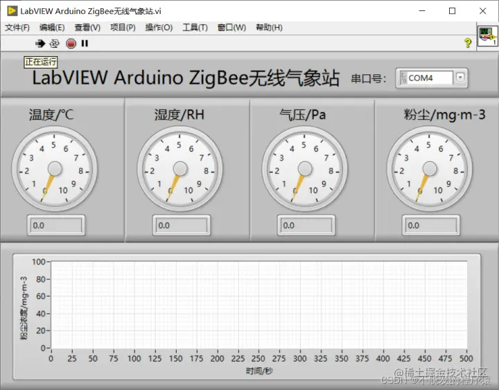 LabVIEW前面板分为仪表盘显示和波形图显示两个部分,仪表盘部分用于显示当前的数据,包括温度、湿度、气压和粉尘浓度;波形图显示部分用于显示粉尘浓度的变化趋势。基于Arduino与LabVIEW的个人小型气象站的LabVIEW上位机前面板,如下图所示: