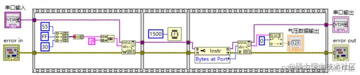 在LabVIEW上位机的程序设计中,温度、湿度、气压和粉尘浓度的采集需要向Arduino Uno控制器发送不同的命令码,并获取Arduino Uno控制器返回的测量数据,为了使得程序结构更加清晰明朗,此处将温度、湿度、气压和粉尘浓度采集分别编写成子VI。