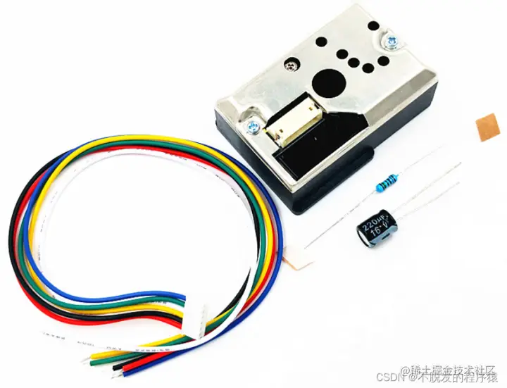 GP2Y1010AU0F是夏普公司的光学空气质量传感器,可以测量空气中尘埃的含量。该装置中包含一个红外发光二极管和光电晶体管,且呈对角布置,允许其检测的反射光在空气中的灰尘,可以非常有效地检测比较微小的颗粒,如香烟烟雾,并且是常用的空气净化器系统。GP2Y1010AU0F实物图效果如下图所示: