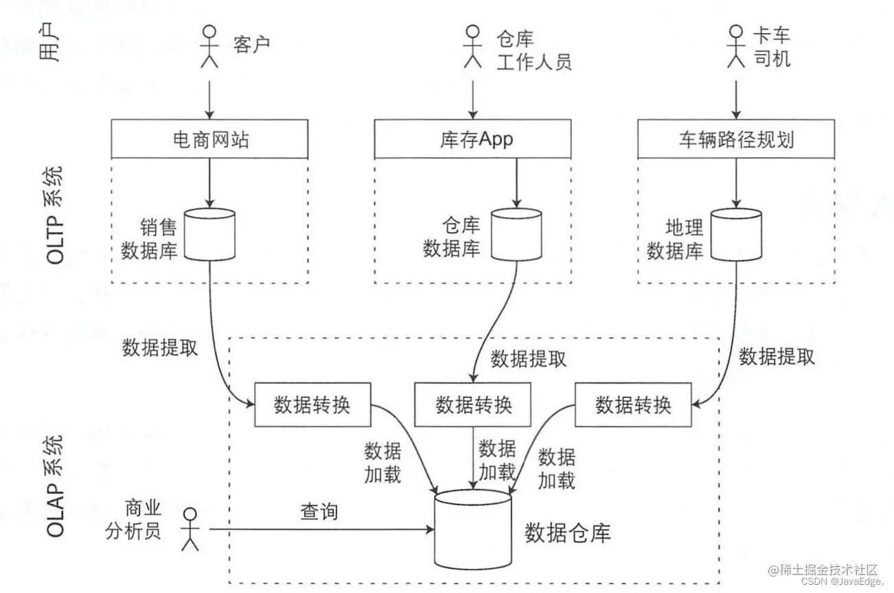 表面上,数仓和关系OLTP数据库相似,因为它们都有SQL查询接口。但系统内部很不同,它们针对迥然不同的查询模式,各自进行了优化。许多数据库供应商都专注支持事务处理或分析工作负载,而不是同时支持。