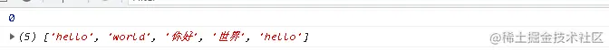 var arr = ['hello', 'world', '你好', '世界', 'hello']var res = arr.indexOf('hello')console.log(res)console.log(arr)