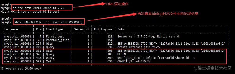 此时看一下,开启gtid之后,mysql在binlog日志文件中的事件这里是如何记录的: