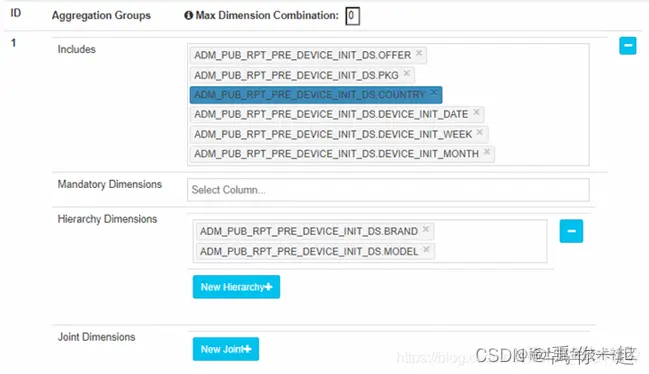 Aggregation Groups 直译过来是聚合组。就是指定 Cube 中哪些维度会同时出现,若 Cube 中有两个维度没有同时出现在任何一个聚合组中,Cube 构建时就不会生成同时包含这两个维度的 Cuboid,聚合组是一个强大的剪枝工具。主要包含以下几项: