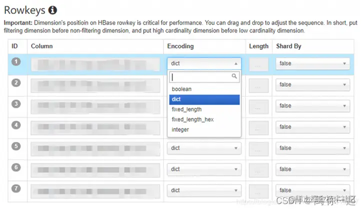 b) dict:字典型,一般把字符串映射为整型,rowkey 中存储映射后的整型数值,字典在运算时会加载到内存中,若维度基数过高,可能会导致内存溢出。此时应考虑换成其他数据编码。