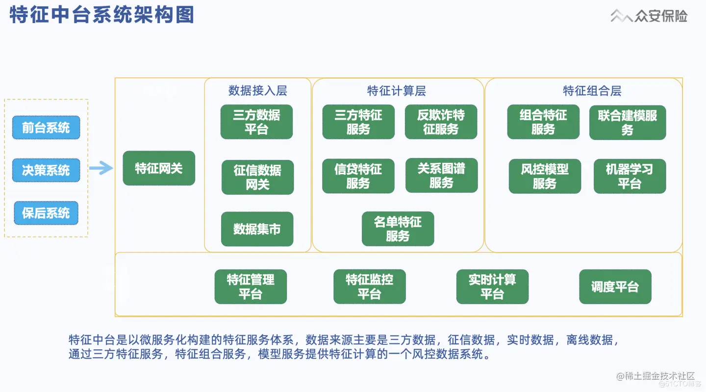 整个特征中台是以微服务化构建的特征服务体系,特征数据来源主要是三方数据,征信数据,实时数据,离线数据。通过三方特征服务,特征组合服务,模型服务提供特征计算的一个风控数据系统。上游包括前台系统、决策系统以及保后系统。整个调用首先会经过特征网关进入数据接入层,之后进入特征计算层,进行相应的服务计算,最后一些需要再加工的特征会进入特征的组合层。下面是整个后台的管理层,实现特征管理的服务能力,比如说特征的管理平台,特征监控平台,特征计算平台以及调度平台。