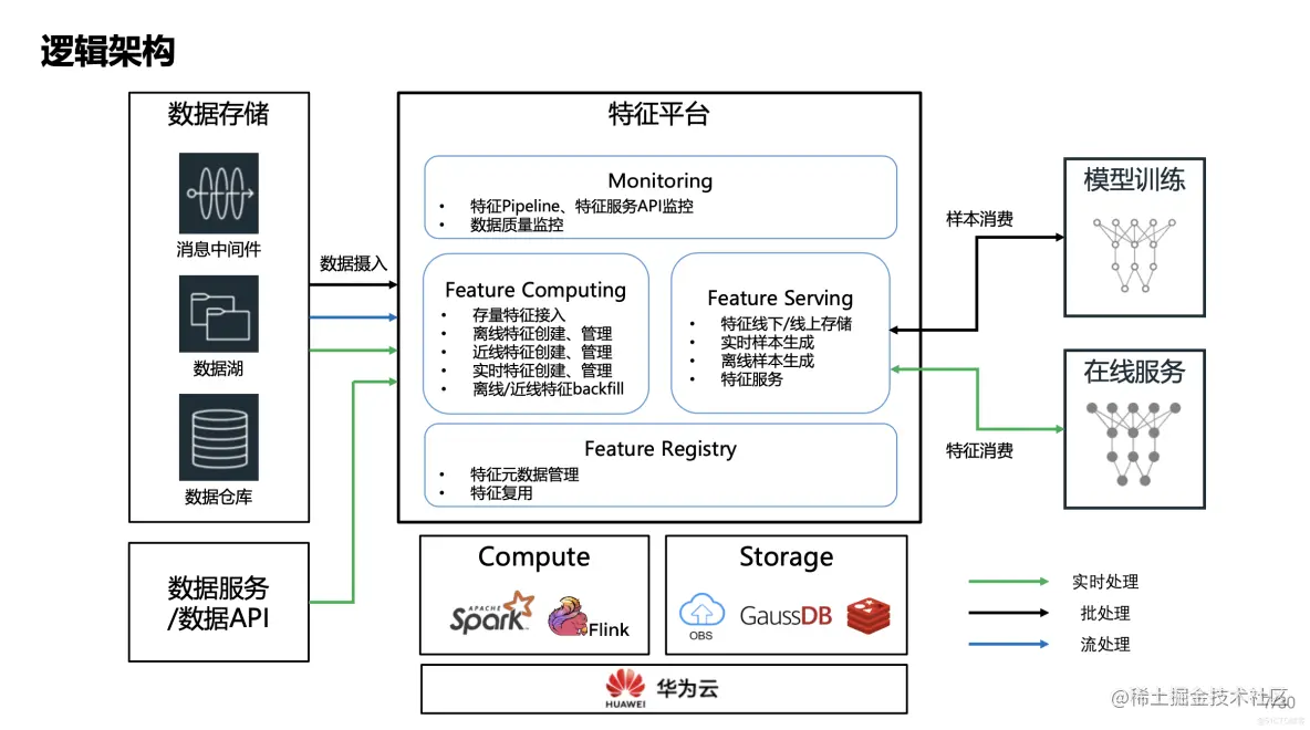 上图是华为商城特征平台的逻辑架构,横向来看,左边是特征计算(Feature Computing),对接现有的数据中台各个存储组件以及数据服务,负责把数据从存储组件中拉取到平台上,完成特定的计算和存储。右边是特征服务(Feature Serving),对外提供消费的统一入口,当右边模型的训练,需要消费样本,这些样本会通过 Feature Serving 的模块进行查询在线服务。推理时所需要实时、高并发、低时延的查询特征,也会通过 Feature Serving 的入口进行调用。