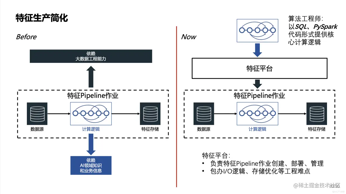 右侧是加入了特征平台之后的情况。算法工程师只需要以 SQL 或者 PySpark 的形式提供核心的特征计算逻辑。平台会负责具体的特征判作业的创建、部署和管理。同时平台还承载了比较偏向工程的 IO 逻辑存储优化等等难点的解决。