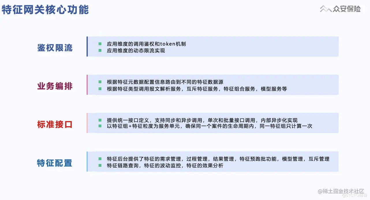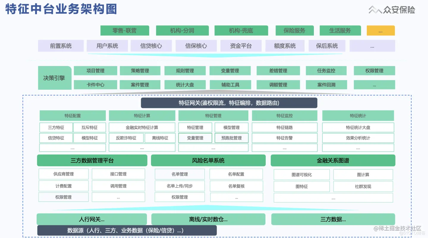 众安保险的金融业务主要是基于信用保证保险,为用户提供信用借贷的服务。我们的特征更多用于风险策略和模型当中。我们的特征服务是服务于线上的金融业务,需要提供实时的金融风控能力,所以特征工程是以特征中台为核心建设的,特征中台围绕稳定性、准确性、实时性、高性能、扩展性五个核心指标,搭建了基于 Flink 的实时计算引擎、使用阿里云 Table Store 的高性能存储引擎,整个特征平台通过平台化为微服务化的架构方式来进行建设。