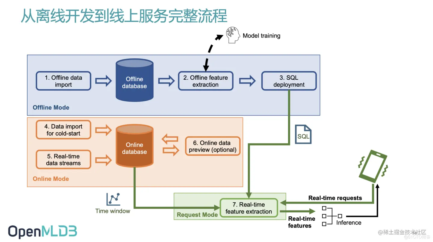 OpenMLDB 是一个开源机器学习数据库,提供了线上线下一致的特征平台。主要面向结构化数据和决策类场景的时序数据特征工程,处理时序数据和基于时间窗口的聚合函数,可以满足生产级上线需求的实时推荐系统。所解决的最核心的问题是线上线下一致性校验带来的高昂工程化落地成本问题,同时提供了毫秒级的实时特征计算。离线开发到线上服务完整流程