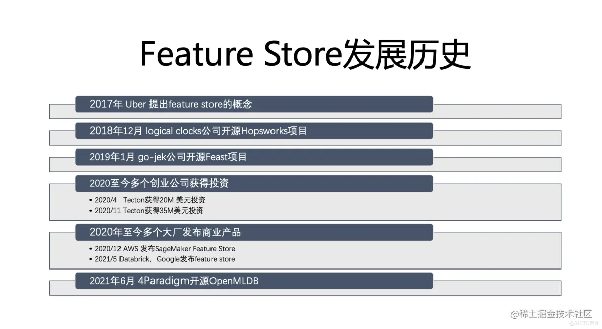 Feature Store 是构建、管理、共享机器学习所需要的特征的中间仓库。自2017年 Uber 首次提出后,发展至今已有多个创业公司获得投资。2020年至今,国内已有多个大厂发布了相应的商业产品和开源项目。