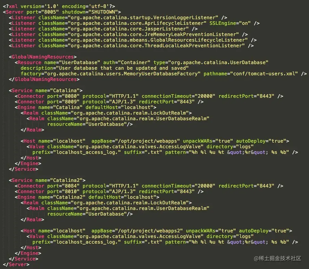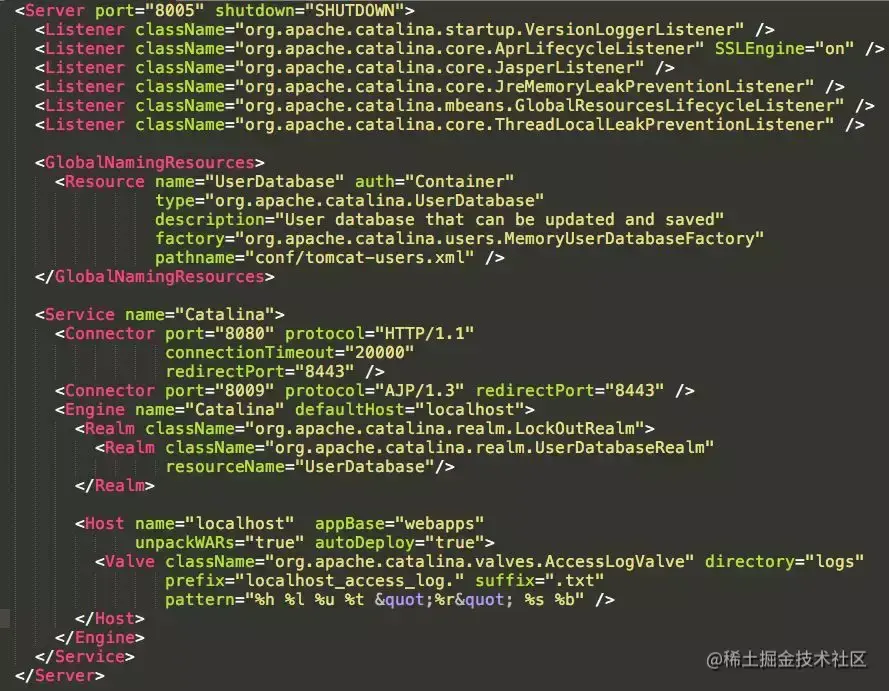 server.xml位于$TOMCAT_HOME/conf目录下;下面是一个server.xml实例。后文中将结合该实例讲解server.xml中,各个元素的含义和作用;在阅读后续章节过程中,可以对照该xml文档便于理解。