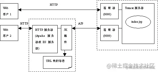 (2)通过配置第2个Connector,客户端可以通过8009端口号使用AJP协议访问Tomcat。AJP协议负责和其他的HTTP服务器(如Apache)建立连接;在把Tomcat与其他HTTP服务器集成时,就需要用到这个连接器。之所以使用Tomcat和其他服务器集成,是因为Tomcat可以用作Servlet/JSP容器,但是对静态资源的处理速度较慢,不如Apache和IIS等HTTP服务器;因此常常将Tomcat与Apache等集成,前者作Servlet容器,后者处理静态资源,而AJP协议便负责Tomcat和Apache的连接。Tomcat与Apache等集成的原理如下图。