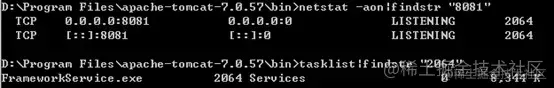 以Win7为例,可以用如下方法找出某个端口是否被其他进程占用:netstat -aon|findstr "8081"发现8081端口被PID为2064的进程占用,tasklist |findstr "2064"发现该进程为FrameworkService.exe(这是McAfee杀毒软件的进程)。