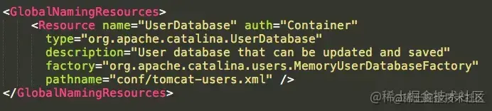 GlobalNamingResources元素定义了全局资源,通过配置可以看出,该配置是通过读取$TOMCAT_HOME/ conf/tomcat-users.xml实现的。