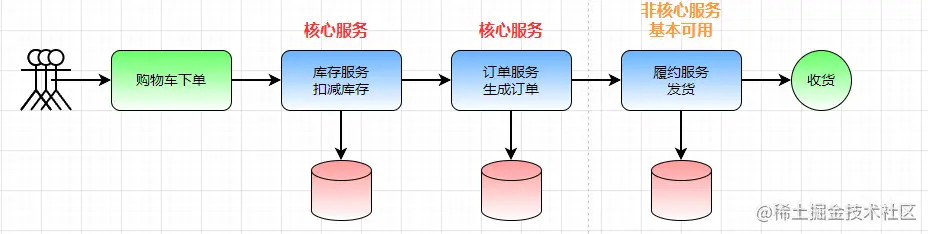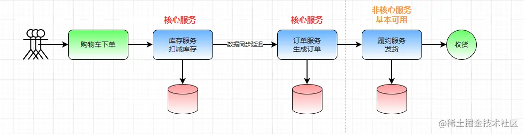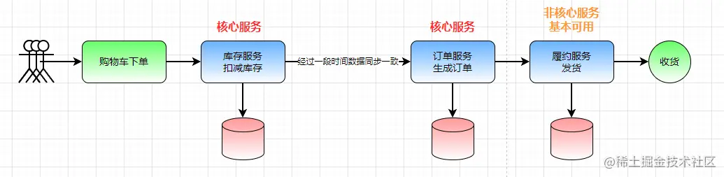 基本可用的意思是,对于我们的核心服务是可以使用的,其他的服务可以适当的降低响应时间,甚至是进行服务降级处理,在当前中,库存和订单肯定是核心服务,至于我们的发货系统在当时只要保证基本可用就行,它的同步可以慢一点或者延迟更高,等待流量高峰过去以后,在进行恢复。