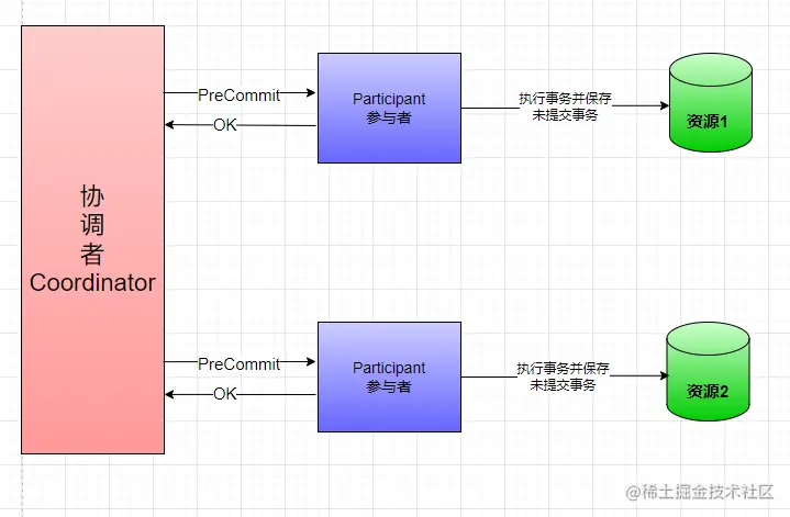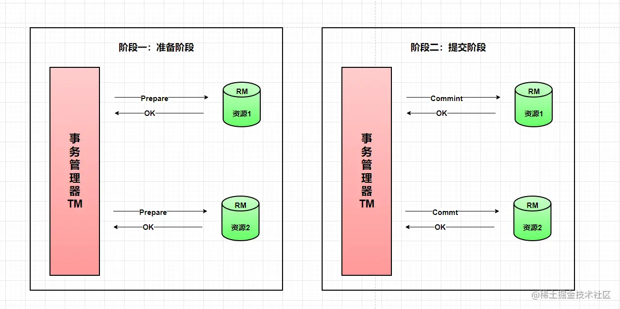 整个事务过程是由事务管理器和参与者组成的,店老板就是事务管理器,你和那个女孩就是参与者,事务管理器决策整个分布式事务在计算机中关系数据支持两阶段提交协议: