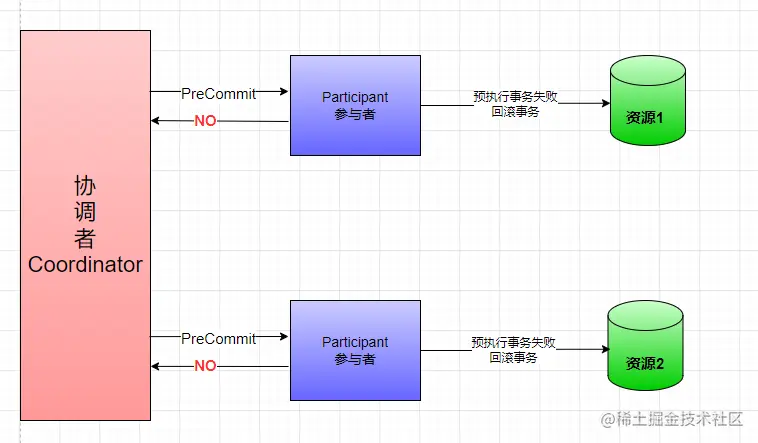 如果参与者不能执行,会返回No命令,释放资源,结束事务。
