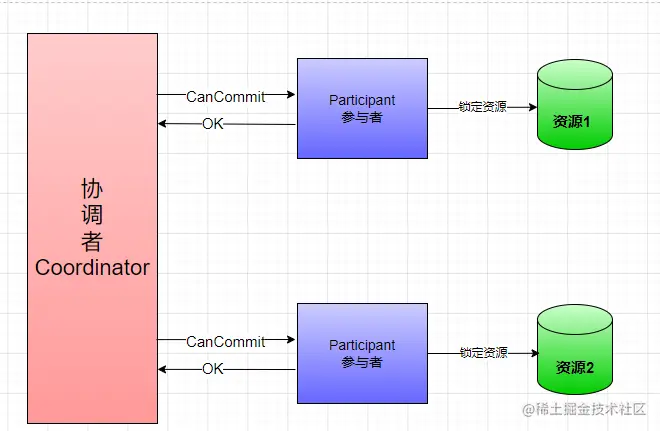 CanCommit阶段 协调者(Coordinator)会向参与者(Participant) 发送CanCommit消息,询问是否可以执行操作,参与者收到消息后,表示能够执行,会返回给协调者能够执行的(yes)命令