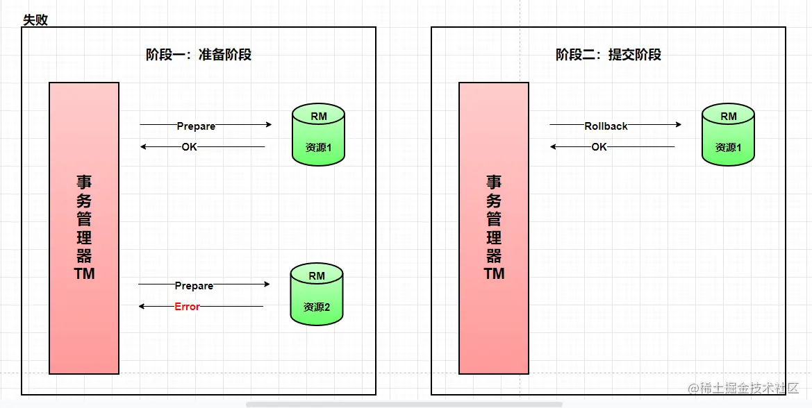 假如任何一个参与者向事务管理器反馈了No指令,或者等待超时之后,事务管理器无法接收到所有参与者的反馈响应,那么中断事务,发送回滚请求,事务管理器向所有参与者节点发送 RollBack 请求,参与者接收到 RollBack 请求后,会利用在阶段一记录的Undo信息执行事务的回滚操作,在完成回滚之后释放事务执行期间占用的资源,参与者在完成事务回滚之后,向协调者发送ACK消息,事务管理器在接受到所有参与者反馈的ACK消息之后,完成事务中断。