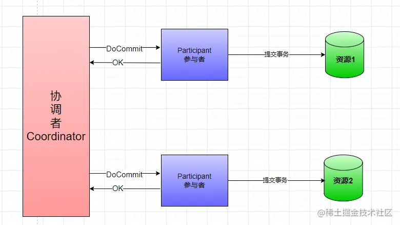 协调者收到所有参与者返回的状态都是YES,这时协调者会向所有的参与者都发送 DoCommit ,参与者收到 DoCommit 后,会真正的提交事务,当事务提交成功后,返回协调者YES状态,表示我已经完成事务的提交了,协调者收到所有参与者都返回YES状态后,那么就完成了本次事务。