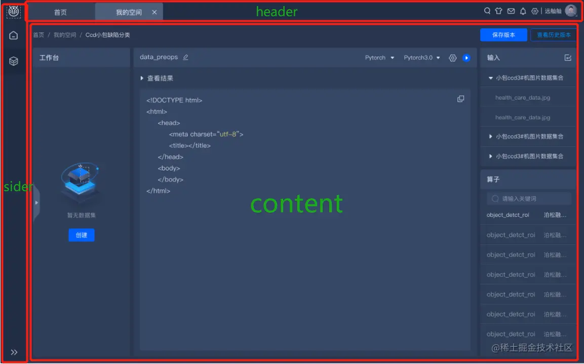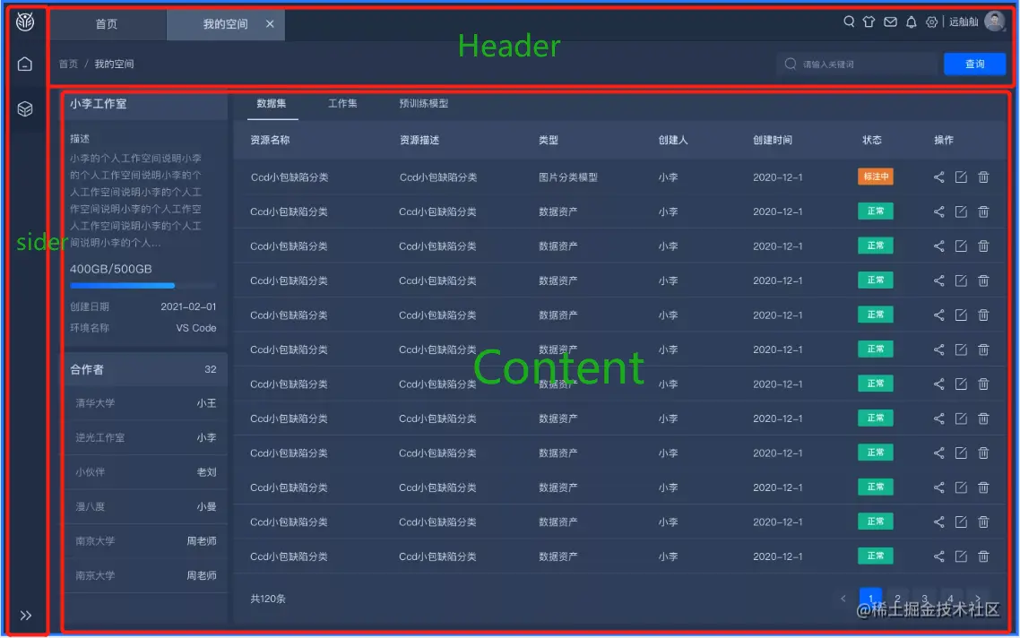 整体的布局就是这样一个 Header,一个 sider,还有内容 content,我们要关心的就是 content 区域。