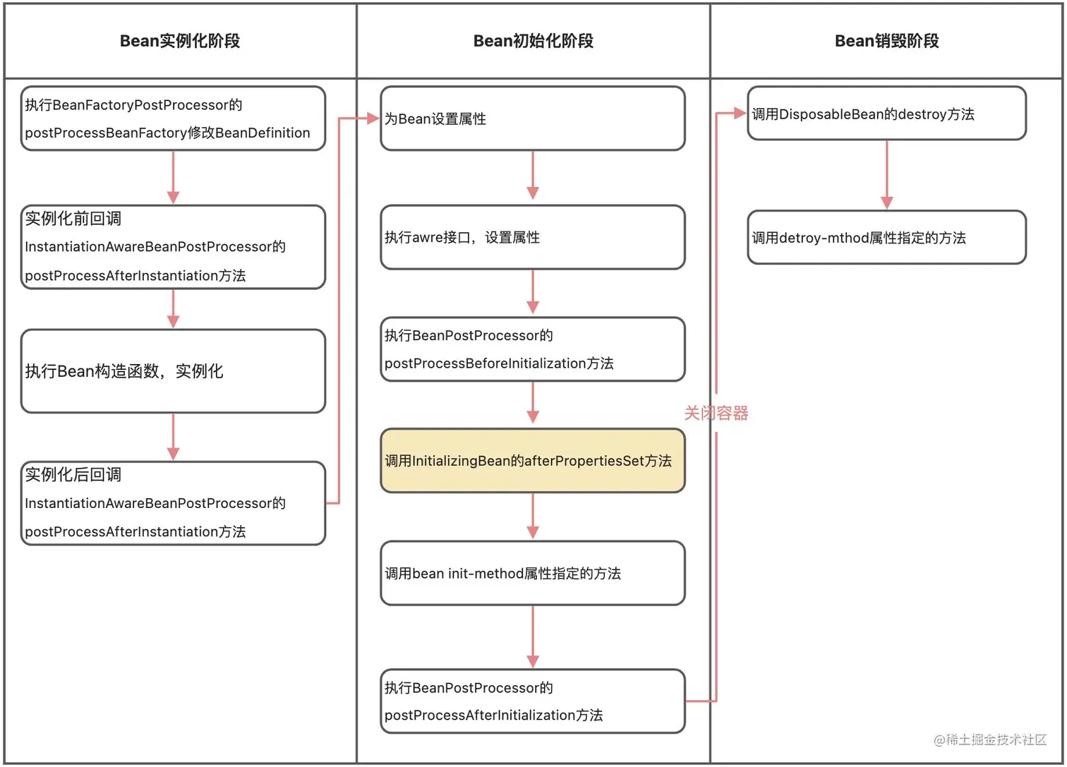 Spring Bean的生命周期是一个比较复杂的过程,从创建到销毁,包含了一些列的过程,本章重点讲解下Spring Bean的afterPropertiesSet()。