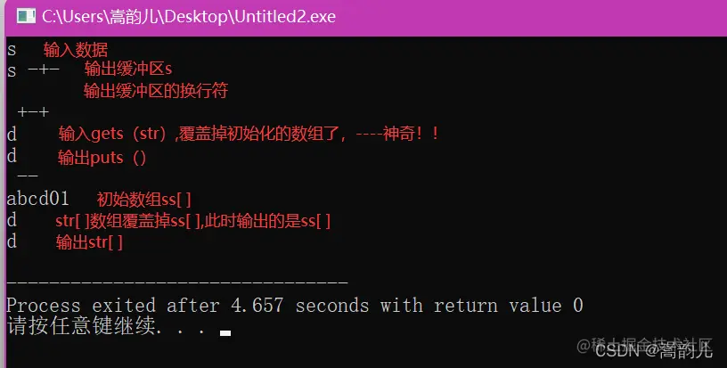 首先gets()函数读取整行输入,直到遇到换行符,然后丢弃换行符,储存其余字符,并在这些字符串的末尾添加一个空字符使之成为一个字符串