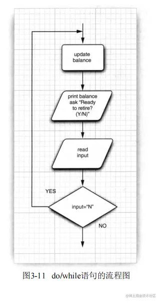 这种循环语句先执行语句(通常是一个语句块),再检测循环条件;然后重复语句,在检测循环条件,以此类推。在例3-4的代码中,首先计算退休账户中的余额,然后在询问是否打算退休: